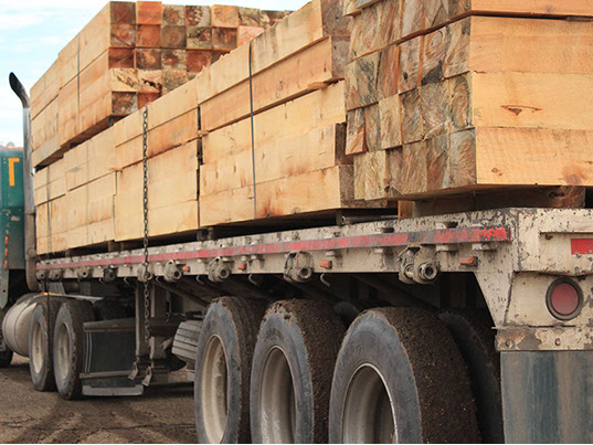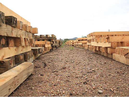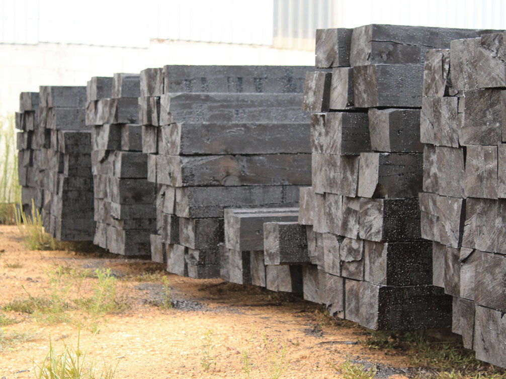 Durmientes de madera de pino de medida 7x8x8 impregnados con creosota para uso en vías férreas.