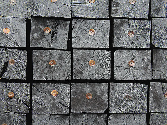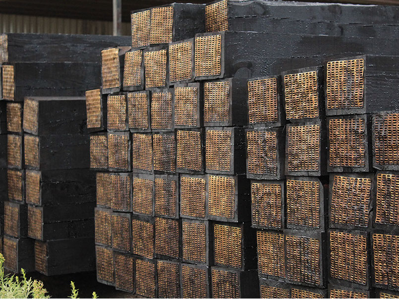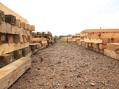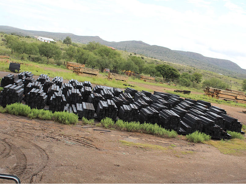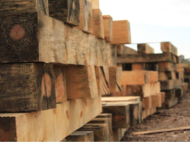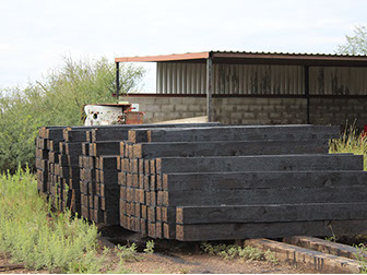 Durmientes de madera de pino de medida 7x8x8 impregnados con creosota para uso en vías férreas.